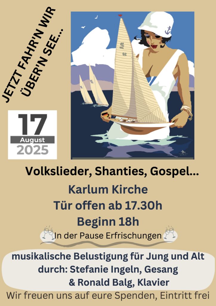 Der Freundeskreis der St. Laurentius Kirche Karlum lädt ein zu einem stimmungsvollen Sommerkonzert mit Stefanie Ingeln (Gesang) und Ronald Balg (Klavier). Unter dem Motto „Jetzt fahr`n wir über`n See“ bringen die beiden Musiker Volkslieder, Shanties, Gospel und Lieder der 70er Jahre zu Gehör. Man ist eingeladen zum Mitsingen und Mitmachen. Der Eintritt ist wie immer frei. Für die Arbeit des Freundeskreises und den Erhalt des Kirchengebäudes werden am Ausgang Spenden erbeten.