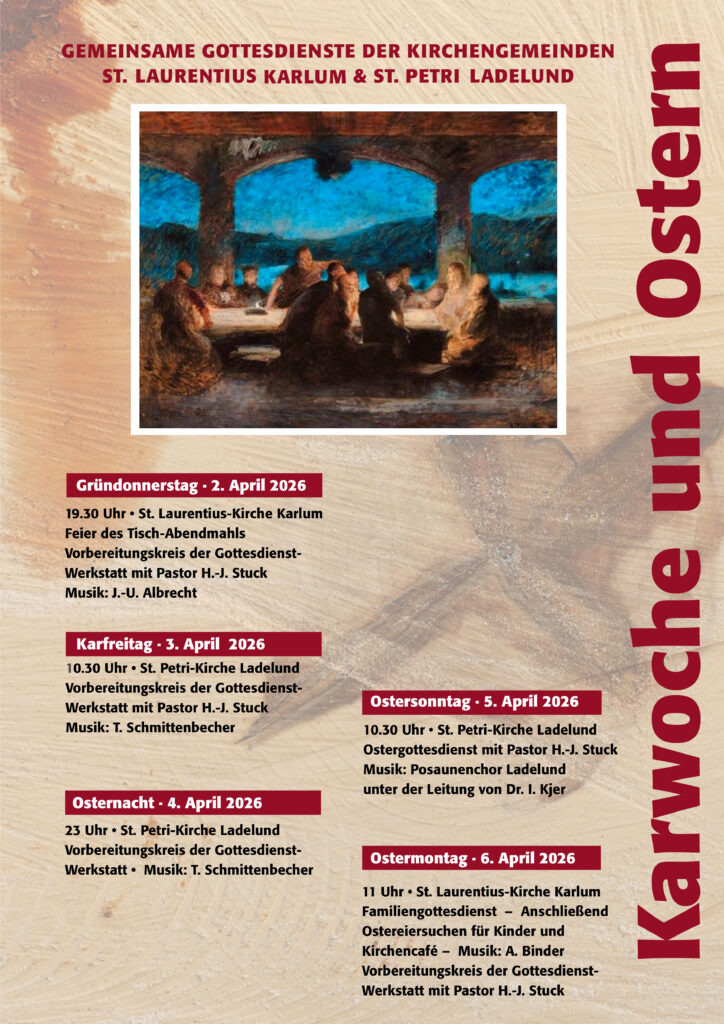 Die Kirchengemeinden St. Laurentius Karlum und St. Petri Ladelund laden herzlich ein zu gemeinsamen Gottesdiensten in der Karwoche und den Ostertagen